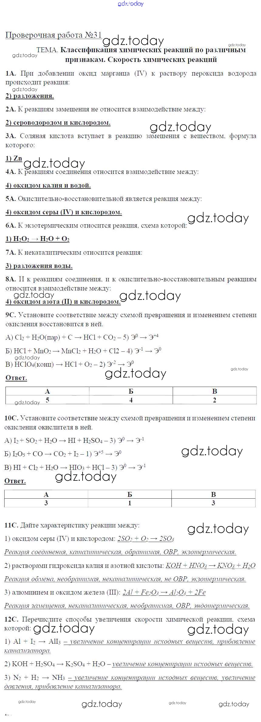 На страницах сайта gdz.today вы найдете учебный и вспомогательный материал, направленный на улучшения знаний школьной программы. ГДЗ - онлайн мир знаний Решение к проверочные работам ПР-31. Классификация химических реакций по различным признакам. Скорость химических реакций Тетради для оценки качества знаний по Химии для 9 класса Габриелян, Крупцова Дрофа Вертикаль 2017