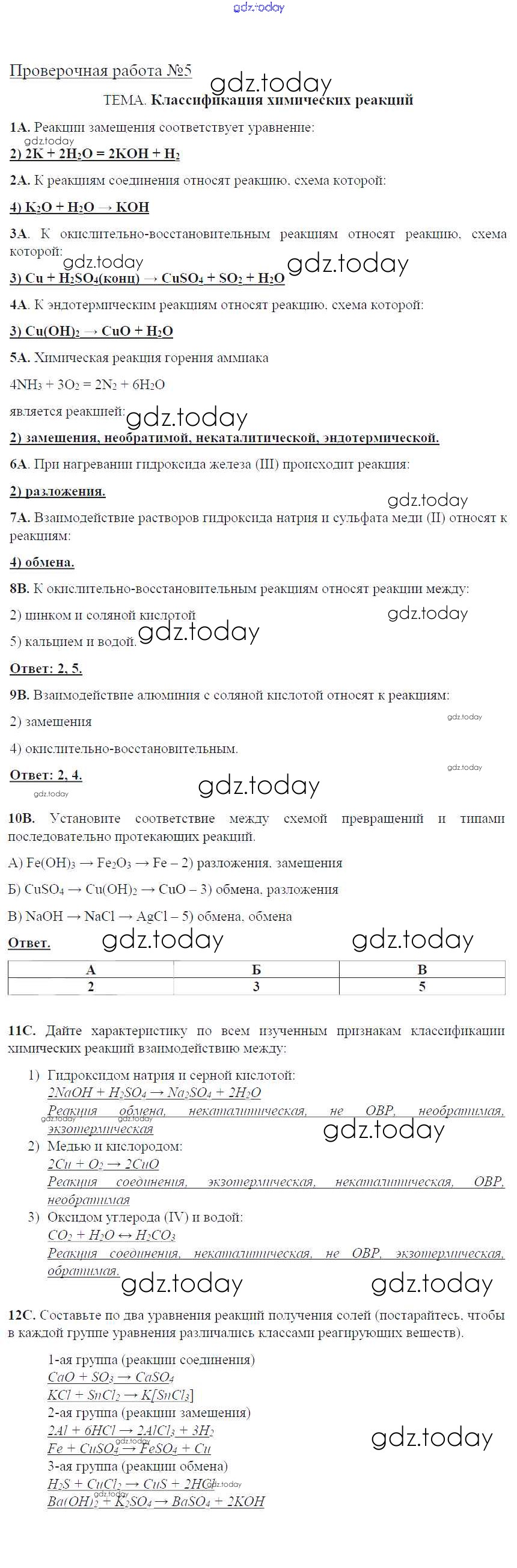 Ответы к Решение к проверочные работам ПР-5. Классификация химических реакций Тетради для оценки качества знаний по Химии для 9 класса Габриелян, Крупцова Дрофа Вертикаль 2017