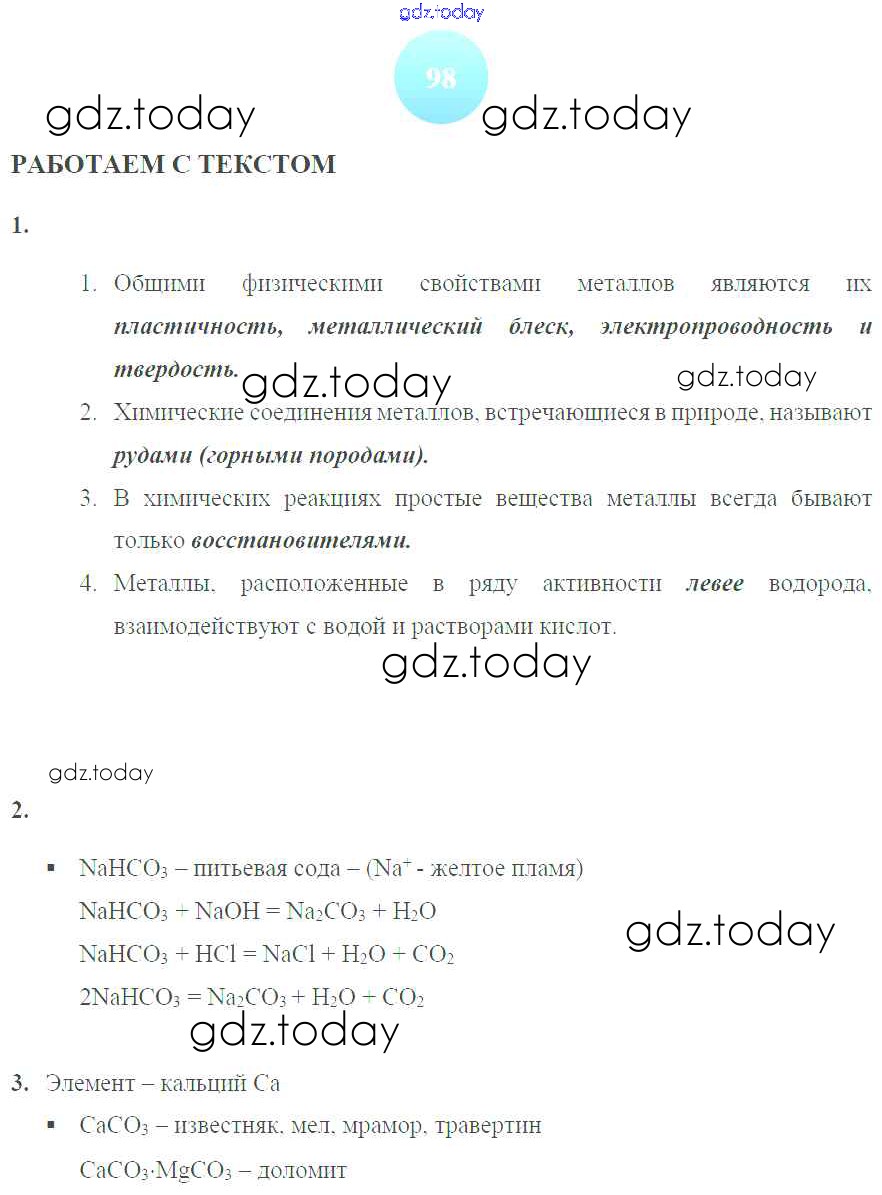 На страницах сайта gdz.today вы найдете учебный и вспомогательный материал, направленный на улучшения знаний школьной программы. ГДЗ - онлайн мир знаний Страницы (решение) 98 Тетради-тренажеру по Химии для 9 класса Гара Просвещение Академический школьный учебник 2014