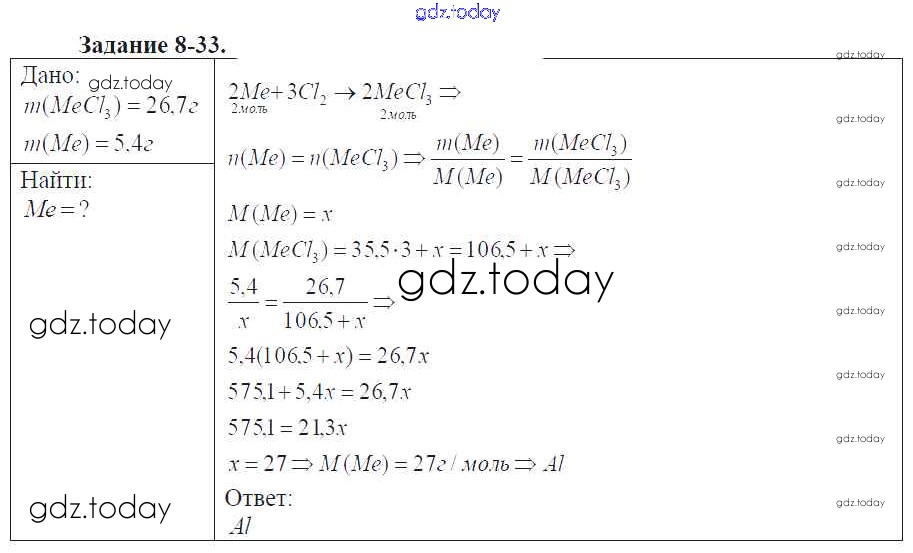 На страницах сайта gdz.today вы найдете учебный и вспомогательный материал, направленный на улучшения знаний школьной программы. ГДЗ - онлайн мир знаний Решение к главе №8. Металлы 8-33 Задачнику по Химии для 9 класса Кузнецова, Левкин Вентана-граф Алгоритм успеха 2015