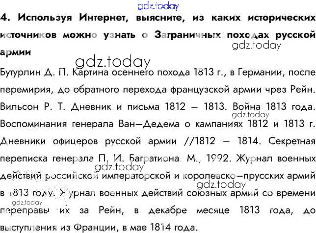 На страницах сайта gdz.today вы найдете учебный и вспомогательный материал, направленный на улучшения знаний школьной программы. ГДЗ - онлайн мир знаний Думаем, сравниваем, размышляем §5. Заграничные походы русской армии. 4 Учебнику по Истории России для 9 класса Арсентьев, Данилов  Просвещение  2016