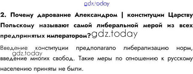 На страницах сайта gdz.today вы найдете учебный и вспомогательный материал, направленный на улучшения знаний школьной программы. ГДЗ - онлайн мир знаний Вопросы и задания §6. Либеральные и охранительные тенденции во внутренней политике Александра I в 1815-1825 гг. 2 Учебнику по Истории России для 9 класса Арсентьев, Данилов  Просвещение  2016