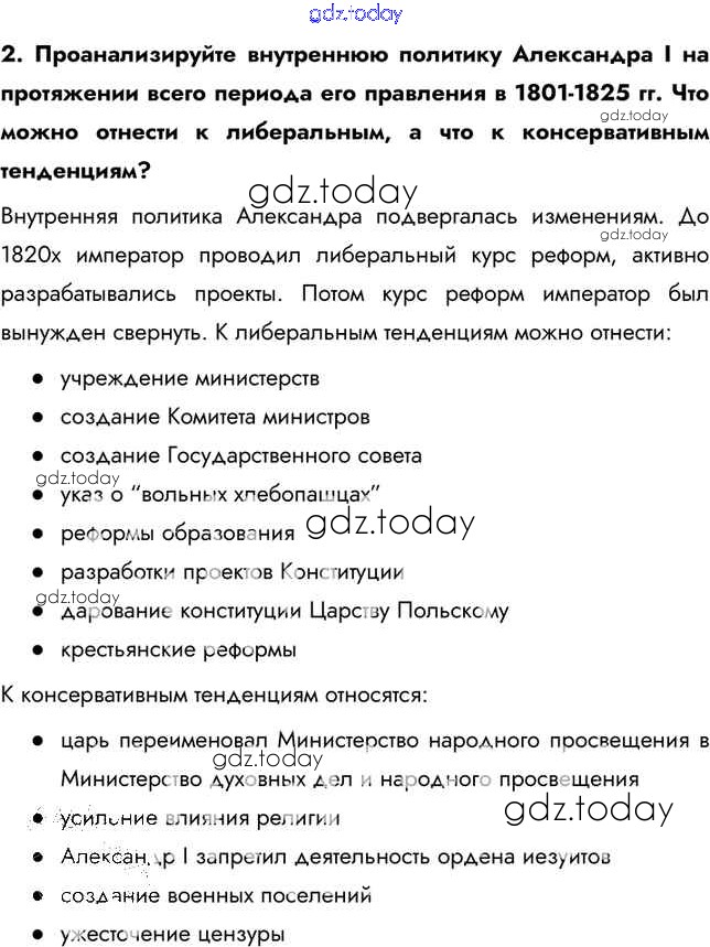 На страницах сайта gdz.today вы найдете учебный и вспомогательный материал, направленный на улучшения знаний школьной программы. ГДЗ - онлайн мир знаний Думаем, сравниваем, размышляем §6. Либеральные и охранительные тенденции во внутренней политике Александра I в 1815-1825 гг. 2 Учебнику по Истории России для 9 класса Арсентьев, Данилов  Просвещение  2016