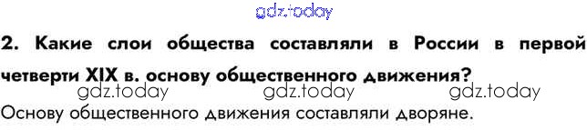 На страницах сайта gdz.today вы найдете учебный и вспомогательный материал, направленный на улучшения знаний школьной программы. ГДЗ - онлайн мир знаний Вопросы и задания §8-9. Общественное движение при Александре I. Выступление декабристов 2 Учебнику по Истории России для 9 класса Арсентьев, Данилов  Просвещение  2016