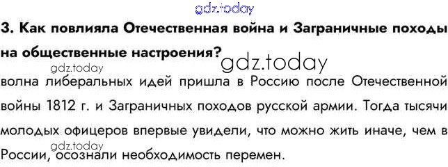 На страницах сайта gdz.today вы найдете учебный и вспомогательный материал, направленный на улучшения знаний школьной программы. ГДЗ - онлайн мир знаний Вопросы и задания §8-9. Общественное движение при Александре I. Выступление декабристов 3 Учебнику по Истории России для 9 класса Арсентьев, Данилов  Просвещение  2016