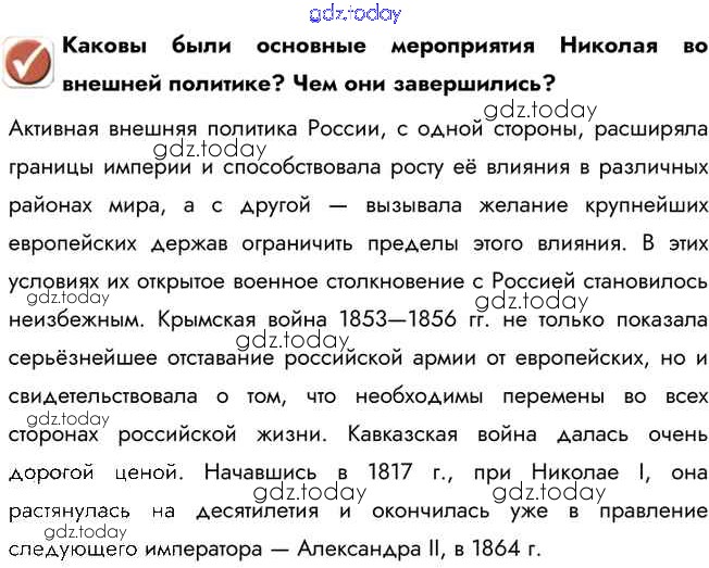 На страницах сайта gdz.today вы найдете учебный и вспомогательный материал, направленный на улучшения знаний школьной программы. ГДЗ - онлайн мир знаний Вопрос в начале параграфа §13-14. Внешняя политика Николая I 1 Учебнику по Истории России для 9 класса Арсентьев, Данилов  Просвещение  2016