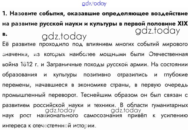 На страницах сайта gdz.today вы найдете учебный и вспомогательный материал, направленный на улучшения знаний школьной программы. ГДЗ - онлайн мир знаний Вопросы и задания Культурное пространство империи в первой половине XIX в 1 Учебнику по Истории России для 9 класса Арсентьев, Данилов Просвещение 2016