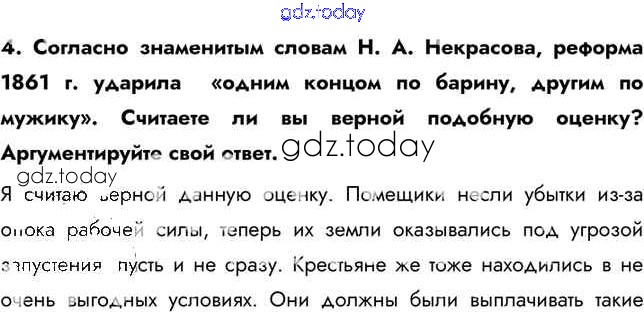 На страницах сайта gdz.today вы найдете учебный и вспомогательный материал, направленный на улучшения знаний школьной программы. ГДЗ - онлайн мир знаний Думаем, сравниваем, размышляем § 16. Александр II: начало правления. Крестьянская реформа 1861 г. 4 Учебнику по Истории России для 9 класса Арсентьев, Данилов  Просвещение  2016