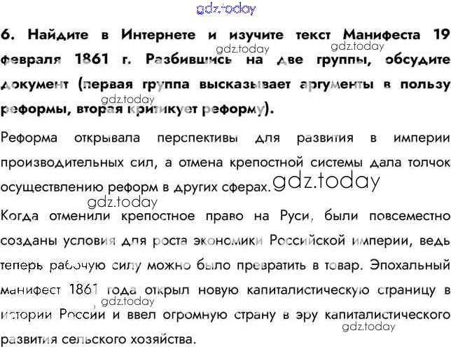 На страницах сайта gdz.today вы найдете учебный и вспомогательный материал, направленный на улучшения знаний школьной программы. ГДЗ - онлайн мир знаний Думаем, сравниваем, размышляем § 16. Александр II: начало правления. Крестьянская реформа 1861 г. 6 Учебнику по Истории России для 9 класса Арсентьев, Данилов  Просвещение  2016