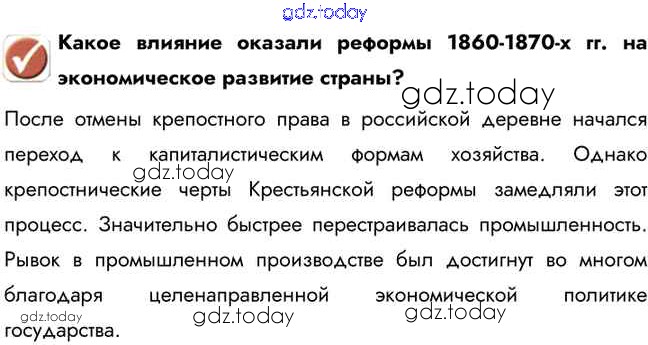 На страницах сайта gdz.today вы найдете учебный и вспомогательный материал, направленный на улучшения знаний школьной программы. ГДЗ - онлайн мир знаний Вопрос в начале параграфа § 18. Социально-экономическое развитие страны в пореформенный период 1 Учебнику по Истории России для 9 класса Арсентьев, Данилов  Просвещение  2016