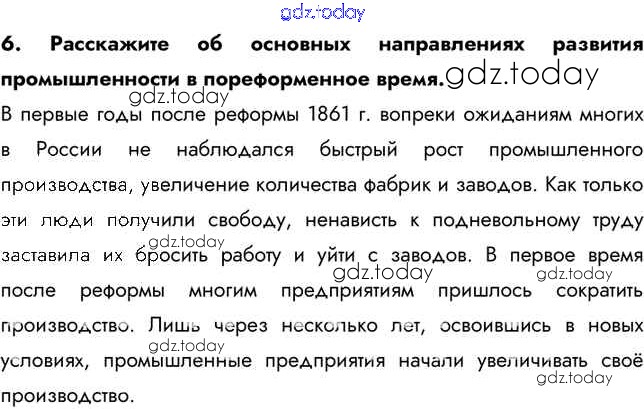 На страницах сайта gdz.today вы найдете учебный и вспомогательный материал, направленный на улучшения знаний школьной программы. ГДЗ - онлайн мир знаний Вопросы и задания § 18. Социально-экономическое развитие страны в пореформенный период 6 Учебнику по Истории России для 9 класса Арсентьев, Данилов  Просвещение  2016