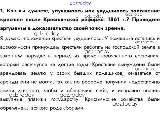 На страницах сайта gdz.today вы найдете учебный и вспомогательный материал, направленный на улучшения знаний школьной программы. ГДЗ - онлайн мир знаний Думаем, сравниваем, размышляем § 18. Социально-экономическое развитие страны в пореформенный период 1 Учебнику по Истории России для 9 класса Арсентьев, Данилов  Просвещение  2016