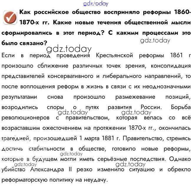 На страницах сайта gdz.today вы найдете учебный и вспомогательный материал, направленный на улучшения знаний школьной программы. ГДЗ - онлайн мир знаний Вопрос в начале параграфа § 19-20. Общественное движение при Александре II и политика правительства 1 Учебнику по Истории России для 9 класса Арсентьев, Данилов  Просвещение  2016