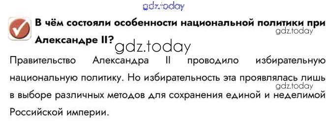 На страницах сайта gdz.today вы найдете учебный и вспомогательный материал, направленный на улучшения знаний школьной программы. ГДЗ - онлайн мир знаний Вопрос в начале параграфа Национальная и религиозная политика Александра II. 1 Учебнику по Истории России для 9 класса Арсентьев, Данилов  Просвещение  2016