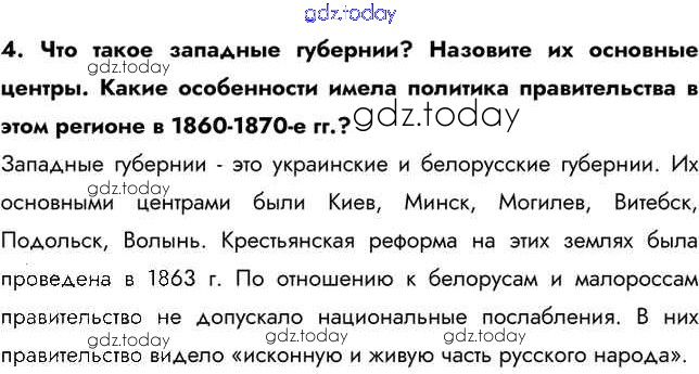 На страницах сайта gdz.today вы найдете учебный и вспомогательный материал, направленный на улучшения знаний школьной программы. ГДЗ - онлайн мир знаний Вопросы и задания Национальная и религиозная политика Александра II. 4 Учебнику по Истории России для 9 класса Арсентьев, Данилов  Просвещение  2016