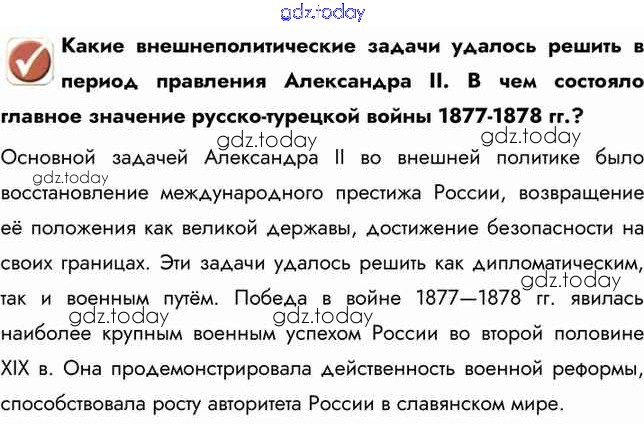 На страницах сайта gdz.today вы найдете учебный и вспомогательный материал, направленный на улучшения знаний школьной программы. ГДЗ - онлайн мир знаний Вопрос в начале параграфа § 21. Внешняя политика Александра II. 1 Учебнику по Истории России для 9 класса Арсентьев, Данилов  Просвещение  2016