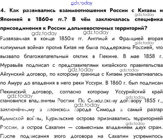 На страницах сайта gdz.today вы найдете учебный и вспомогательный материал, направленный на улучшения знаний школьной программы. ГДЗ - онлайн мир знаний Вопросы и задания § 21. Внешняя политика Александра II. 4 Учебнику по Истории России для 9 класса Арсентьев, Данилов  Просвещение  2016