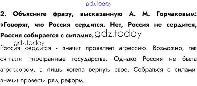 На страницах сайта gdz.today вы найдете учебный и вспомогательный материал, направленный на улучшения знаний школьной программы. ГДЗ - онлайн мир знаний Думаем, сравниваем, размышляем § 21. Внешняя политика Александра II. 2 Учебнику по Истории России для 9 класса Арсентьев, Данилов  Просвещение  2016
