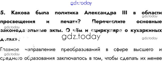 На страницах сайта gdz.today вы найдете учебный и вспомогательный материал, направленный на улучшения знаний школьной программы. ГДЗ - онлайн мир знаний Вопросы и задания § 22. Александр III: особенности внутренней политики 5 Учебнику по Истории России для 9 класса Арсентьев, Данилов  Просвещение  2016