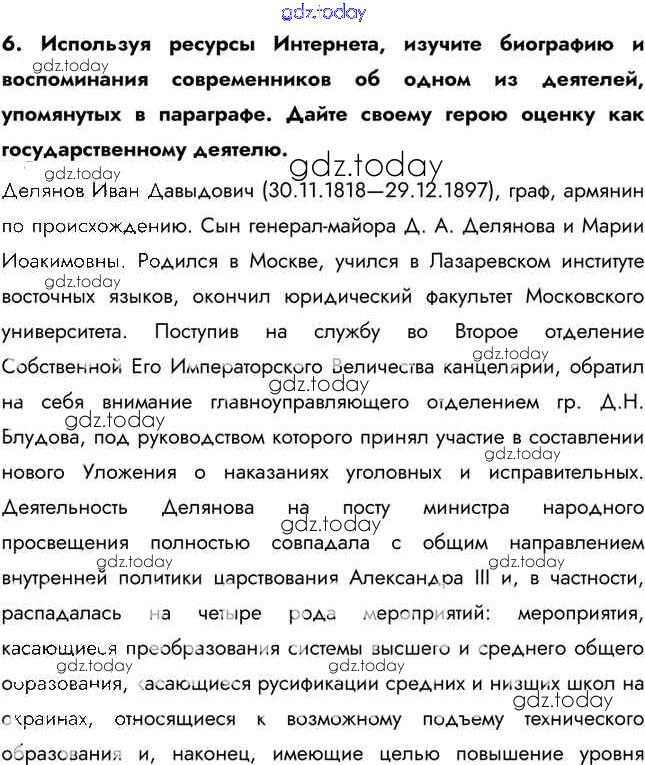 На страницах сайта gdz.today вы найдете учебный и вспомогательный материал, направленный на улучшения знаний школьной программы. ГДЗ - онлайн мир знаний Думаем, сравниваем, размышляем § 22. Александр III: особенности внутренней политики 6 Учебнику по Истории России для 9 класса Арсентьев, Данилов  Просвещение  2016