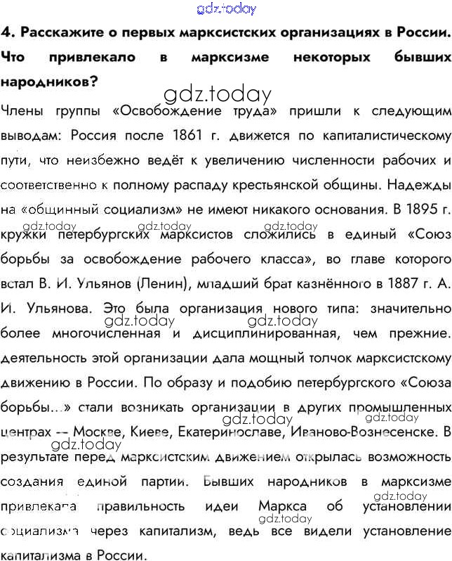 На страницах сайта gdz.today вы найдете учебный и вспомогательный материал, направленный на улучшения знаний школьной программы. ГДЗ - онлайн мир знаний Вопросы и задания § 24. Общественное движение в 1880-х - первой половине 1890-х гг. 4 Учебнику по Истории России для 9 класса Арсентьев, Данилов  Просвещение  2016