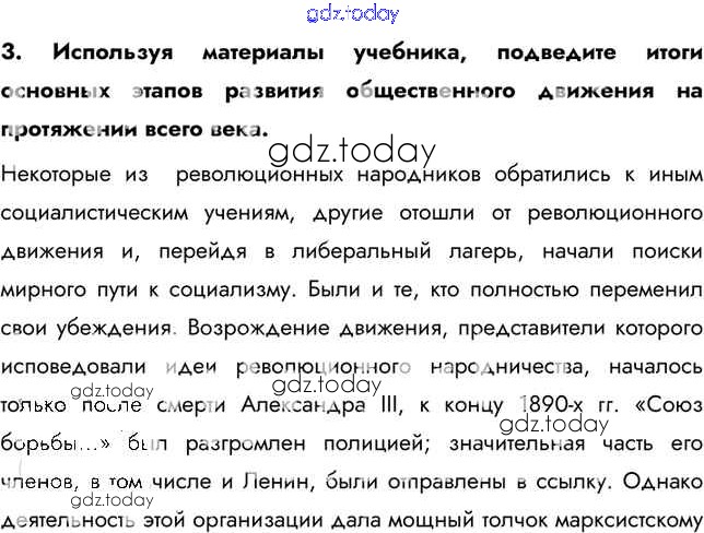 На страницах сайта gdz.today вы найдете учебный и вспомогательный материал, направленный на улучшения знаний школьной программы. ГДЗ - онлайн мир знаний Думаем, сравниваем, размышляем § 24. Общественное движение в 1880-х - первой половине 1890-х гг. 3 Учебнику по Истории России для 9 класса Арсентьев, Данилов  Просвещение  2016