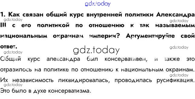 На страницах сайта gdz.today вы найдете учебный и вспомогательный материал, направленный на улучшения знаний школьной программы. ГДЗ - онлайн мир знаний Думаем, сравниваем, размышляем Национальная и религиозная политика Александра III 1 Учебнику по Истории России для 9 класса Арсентьев, Данилов  Просвещение  2016