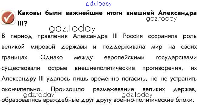 На страницах сайта gdz.today вы найдете учебный и вспомогательный материал, направленный на улучшения знаний школьной программы. ГДЗ - онлайн мир знаний Вопрос в начале параграфа § 25. Внешняя политика Александра III 1 Учебнику по Истории России для 9 класса Арсентьев, Данилов  Просвещение  2016
