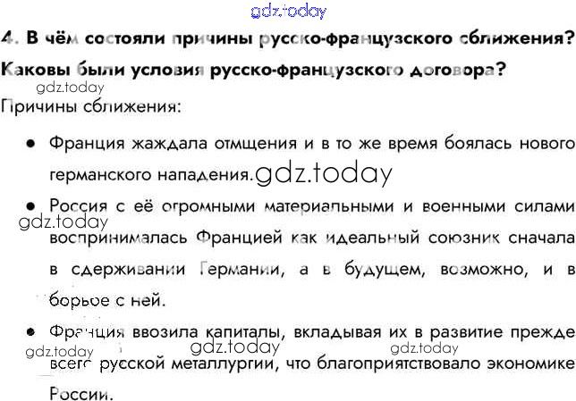 На страницах сайта gdz.today вы найдете учебный и вспомогательный материал, направленный на улучшения знаний школьной программы. ГДЗ - онлайн мир знаний Вопросы и задания § 25. Внешняя политика Александра III 4 Учебнику по Истории России для 9 класса Арсентьев, Данилов  Просвещение  2016