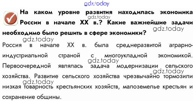На страницах сайта gdz.today вы найдете учебный и вспомогательный материал, направленный на улучшения знаний школьной программы. ГДЗ - онлайн мир знаний Вопрос в начале параграфа § 27. Социально-экономическое развитие страны на рубеже XIX-XX вв. 1 Учебнику по Истории России для 9 класса Арсентьев, Данилов  Просвещение  2016