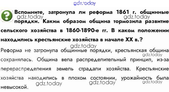 На страницах сайта gdz.today вы найдете учебный и вспомогательный материал, направленный на улучшения знаний школьной программы. ГДЗ - онлайн мир знаний Вопросы § 31. Социально-экономические реформы П. А. Столыпина Стр. 99 Учебнику по Истории России для 9 класса Арсентьев, Данилов  Просвещение  2016