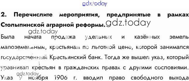 На страницах сайта gdz.today вы найдете учебный и вспомогательный материал, направленный на улучшения знаний школьной программы. ГДЗ - онлайн мир знаний Вопросы и задания § 31. Социально-экономические реформы П. А. Столыпина 2 Учебнику по Истории России для 9 класса Арсентьев, Данилов  Просвещение  2016