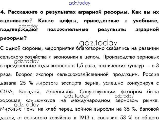 На страницах сайта gdz.today вы найдете учебный и вспомогательный материал, направленный на улучшения знаний школьной программы. ГДЗ - онлайн мир знаний Вопросы и задания § 31. Социально-экономические реформы П. А. Столыпина 4 Учебнику по Истории России для 9 класса Арсентьев, Данилов  Просвещение  2016