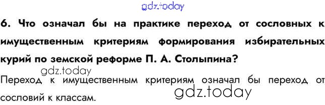 На страницах сайта gdz.today вы найдете учебный и вспомогательный материал, направленный на улучшения знаний школьной программы. ГДЗ - онлайн мир знаний Вопросы и задания § 31. Социально-экономические реформы П. А. Столыпина 6 Учебнику по Истории России для 9 класса Арсентьев, Данилов  Просвещение  2016