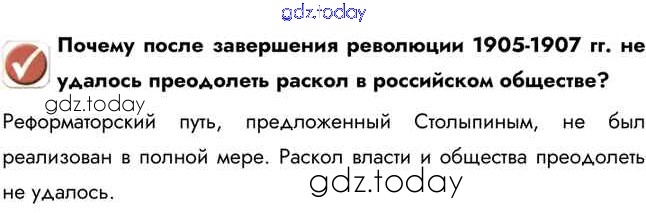 На страницах сайта gdz.today вы найдете учебный и вспомогательный материал, направленный на улучшения знаний школьной программы. ГДЗ - онлайн мир знаний Вопрос в начале параграфа § 32. Политическое развитие страны в 1907-1914 гг. 1 Учебнику по Истории России для 9 класса Арсентьев, Данилов  Просвещение  2016