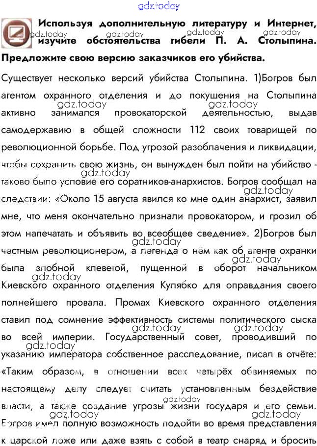 На страницах сайта gdz.today вы найдете учебный и вспомогательный материал, направленный на улучшения знаний школьной программы. ГДЗ - онлайн мир знаний Историки спорят § 32. Политическое развитие страны в 1907-1914 гг. Стр.109 Учебнику по Истории России для 9 класса Арсентьев, Данилов  Просвещение  2016