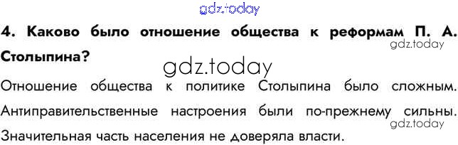 На страницах сайта gdz.today вы найдете учебный и вспомогательный материал, направленный на улучшения знаний школьной программы. ГДЗ - онлайн мир знаний Вопросы и задания § 32. Политическое развитие страны в 1907-1914 гг. 4 Учебнику по Истории России для 9 класса Арсентьев, Данилов  Просвещение  2016