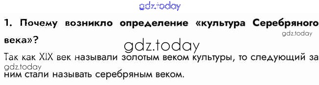 На страницах сайта gdz.today вы найдете учебный и вспомогательный материал, направленный на улучшения знаний школьной программы. ГДЗ - онлайн мир знаний Вопросы и задания Серебряный век русской культуры. 1 Учебнику по Истории России для 9 класса Арсентьев, Данилов  Просвещение  2016