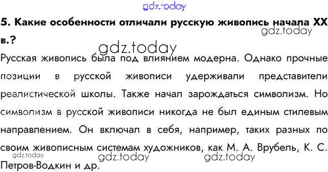На страницах сайта gdz.today вы найдете учебный и вспомогательный материал, направленный на улучшения знаний школьной программы. ГДЗ - онлайн мир знаний Вопросы и задания Серебряный век русской культуры. 5 Учебнику по Истории России для 9 класса Арсентьев, Данилов  Просвещение  2016