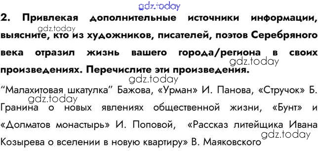 На страницах сайта gdz.today вы найдете учебный и вспомогательный материал, направленный на улучшения знаний школьной программы. ГДЗ - онлайн мир знаний Думаем, сравниваем, размышляем Серебряный век русской культуры. 2 Учебнику по Истории России для 9 класса Арсентьев, Данилов  Просвещение  2016