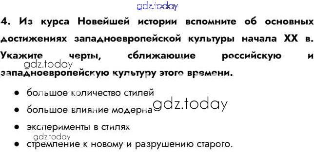 На страницах сайта gdz.today вы найдете учебный и вспомогательный материал, направленный на улучшения знаний школьной программы. ГДЗ - онлайн мир знаний Думаем, сравниваем, размышляем Серебряный век русской культуры. 4 Учебнику по Истории России для 9 класса Арсентьев, Данилов  Просвещение  2016