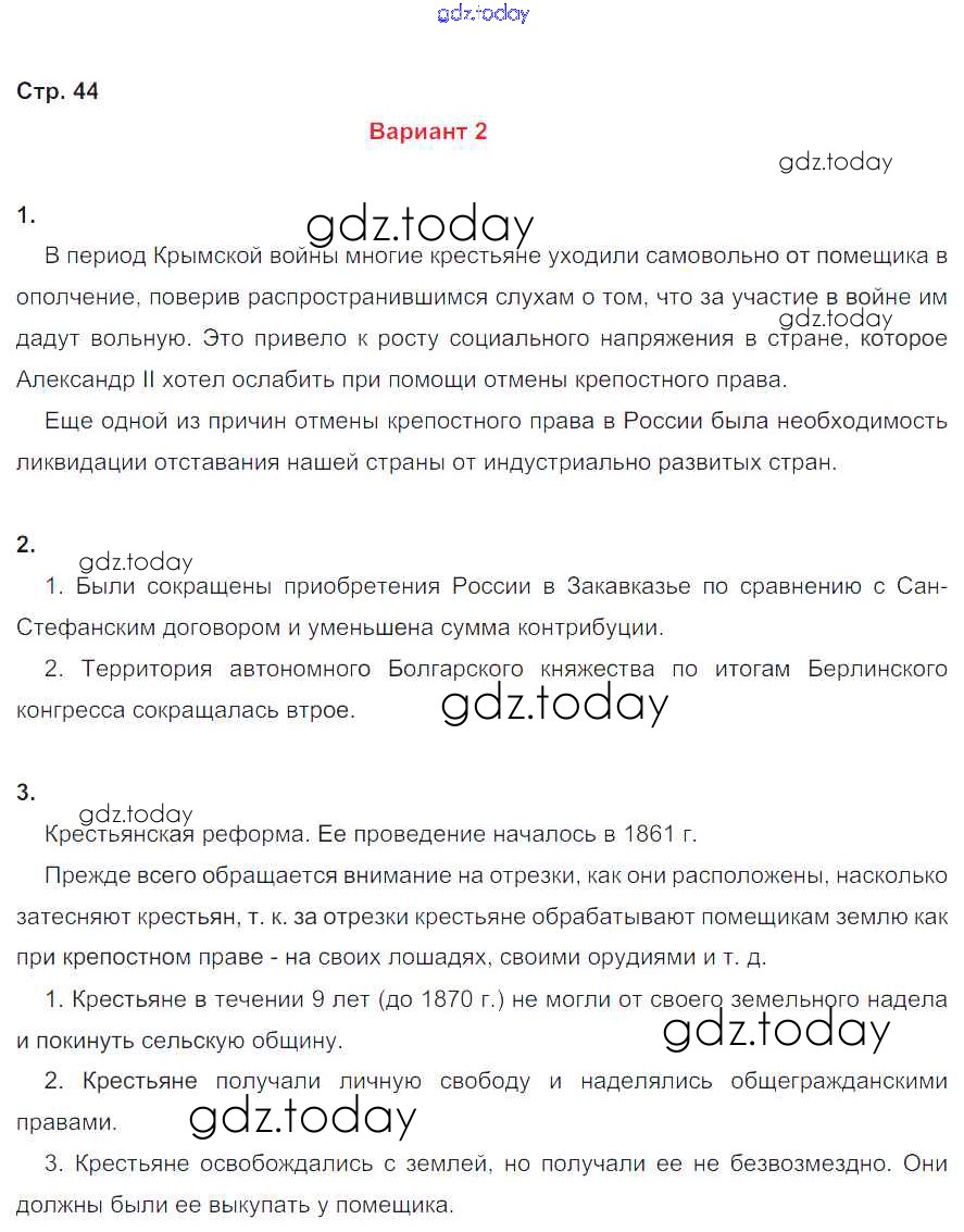 На страницах сайта gdz.today вы найдете учебный и вспомогательный материал, направленный на улучшения знаний школьной программы. ГДЗ - онлайн мир знаний Страницы (решение) 44 Контрольным работам по Истории России для 9 класса Артасов Просвещение УМК 2017
