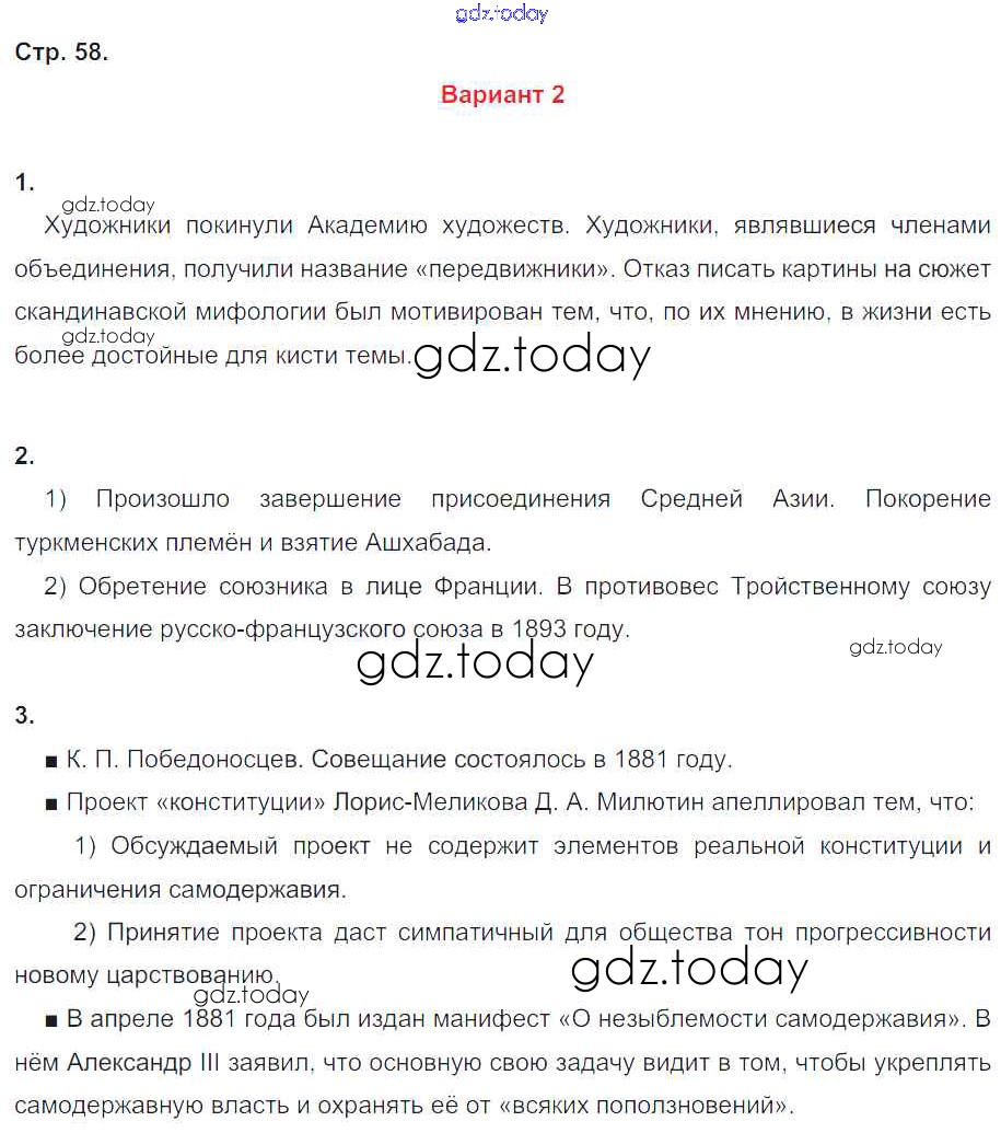 На страницах сайта gdz.today вы найдете учебный и вспомогательный материал, направленный на улучшения знаний школьной программы. ГДЗ - онлайн мир знаний Страницы (решение) 58 Контрольным работам по Истории России для 9 класса Артасов Просвещение УМК 2017