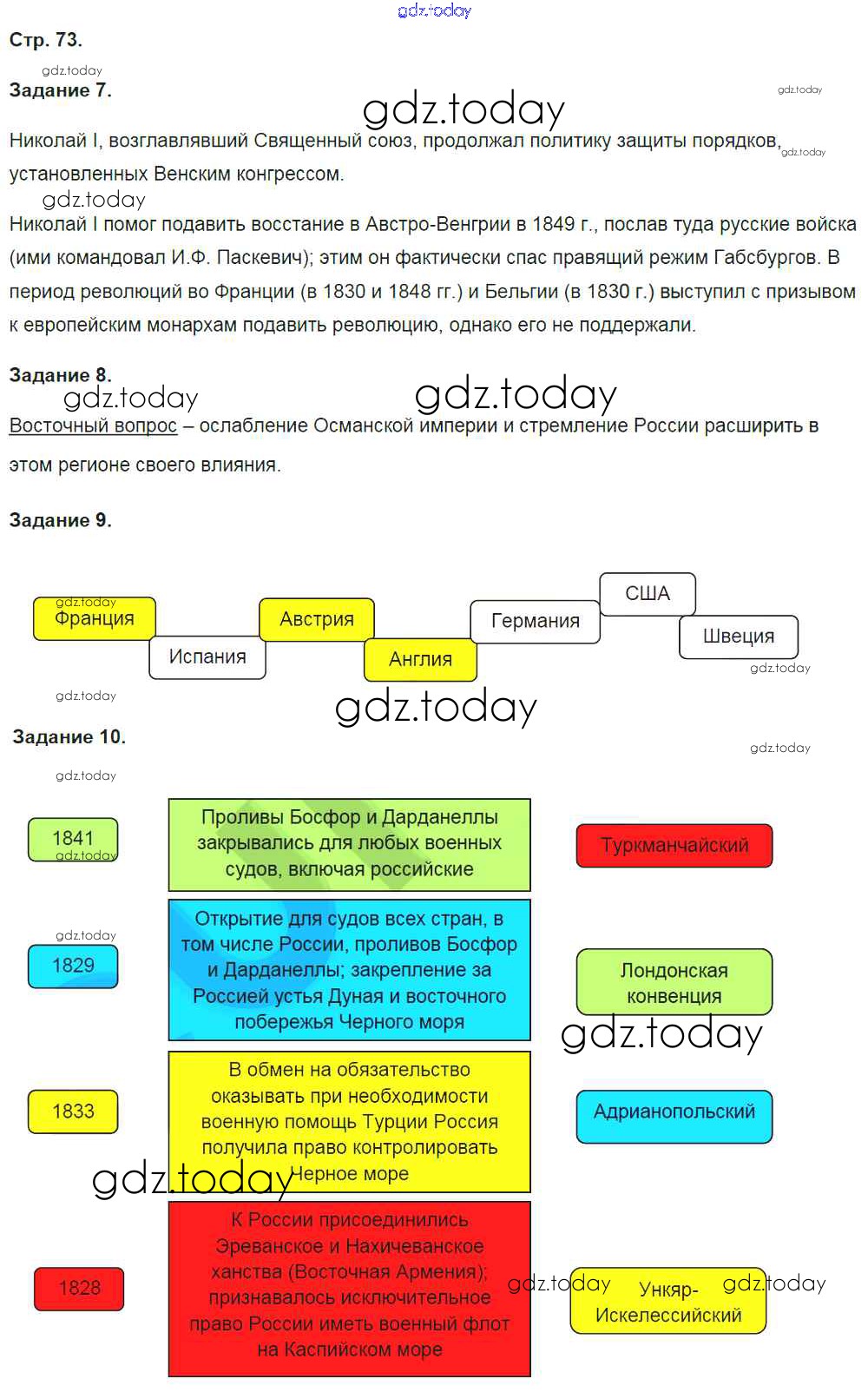 На страницах сайта gdz.today вы найдете учебный и вспомогательный материал, направленный на улучшения знаний школьной программы. ГДЗ - онлайн мир знаний Решение к части 1. Страницы 73 Рабочей тетради по Истории России для 9 класса Чернова Экзамен УМК 2017