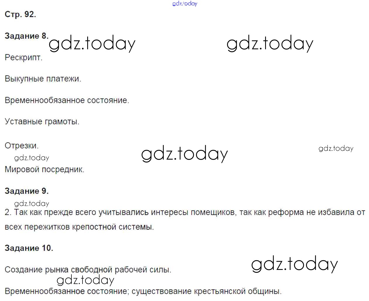 На страницах сайта gdz.today вы найдете учебный и вспомогательный материал, направленный на улучшения знаний школьной программы. ГДЗ - онлайн мир знаний Решение к части 1. Страницы 92 Рабочей тетради по Истории России для 9 класса Чернова Экзамен УМК 2017
