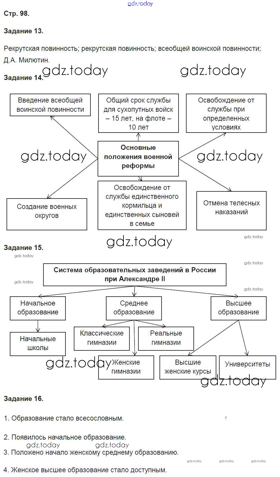 На страницах сайта gdz.today вы найдете учебный и вспомогательный материал, направленный на улучшения знаний школьной программы. ГДЗ - онлайн мир знаний Решение к части 1. Страницы 98 Рабочей тетради по Истории России для 9 класса Чернова Экзамен УМК 2017