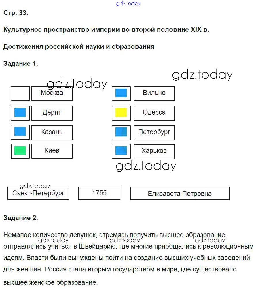 На страницах сайта gdz.today вы найдете учебный и вспомогательный материал, направленный на улучшения знаний школьной программы. ГДЗ - онлайн мир знаний Решение к части 2. Страницы 33 Рабочей тетради по Истории России для 9 класса Чернова Экзамен УМК 2017