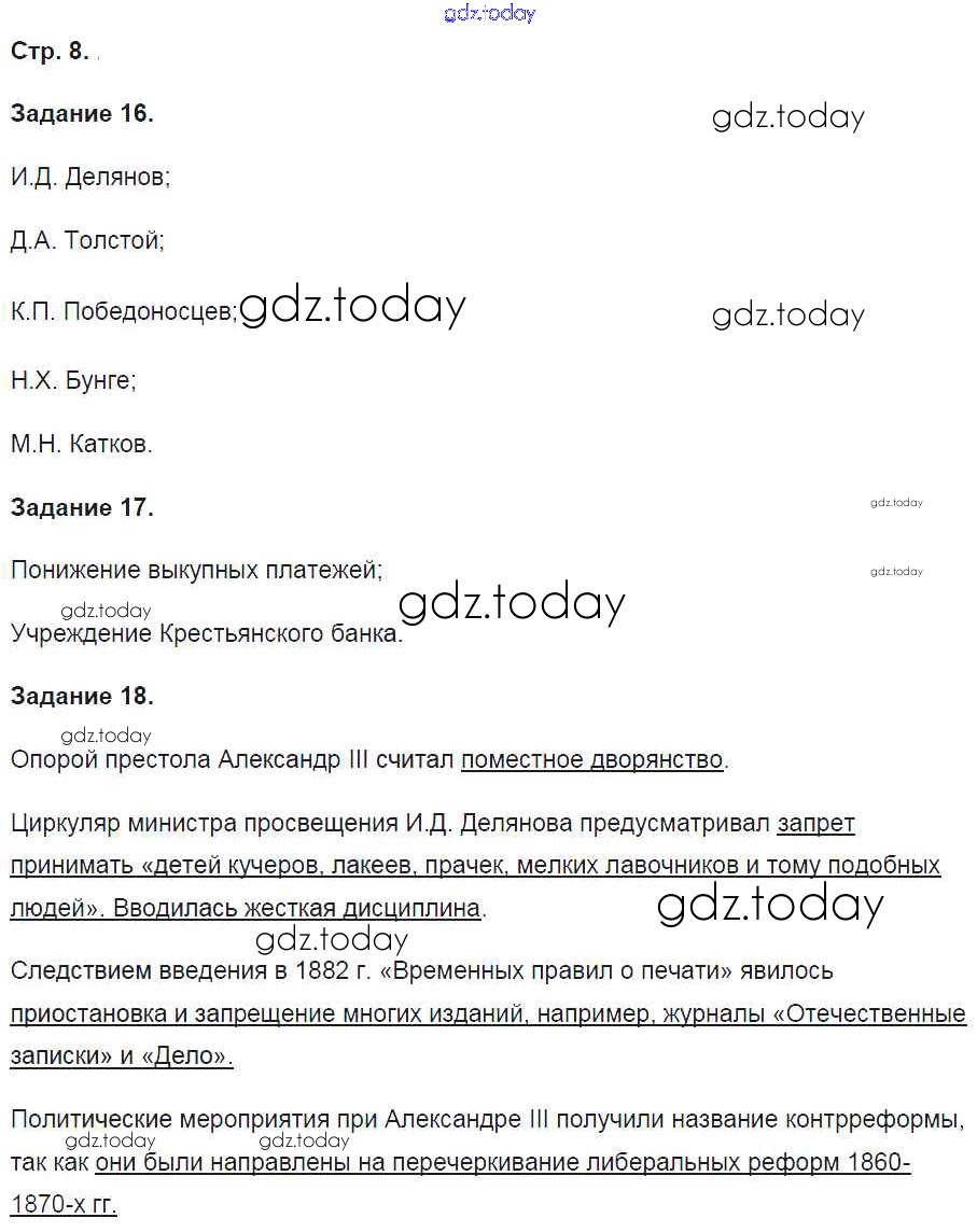 На страницах сайта gdz.today вы найдете учебный и вспомогательный материал, направленный на улучшения знаний школьной программы. ГДЗ - онлайн мир знаний Решение к части 2. Страницы 8 Рабочей тетради по Истории России для 9 класса Чернова Экзамен УМК 2017
