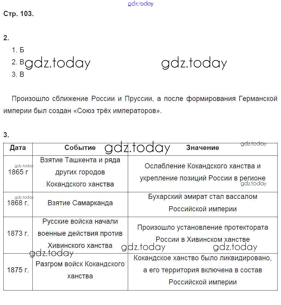 На страницах сайта gdz.today вы найдете учебный и вспомогательный материал, направленный на улучшения знаний школьной программы. ГДЗ - онлайн мир знаний Решение к части 1. Страницы 103 Рабочей тетради по Истории России для 9 класса Данилов, Косулина Просвещение УМК 2017