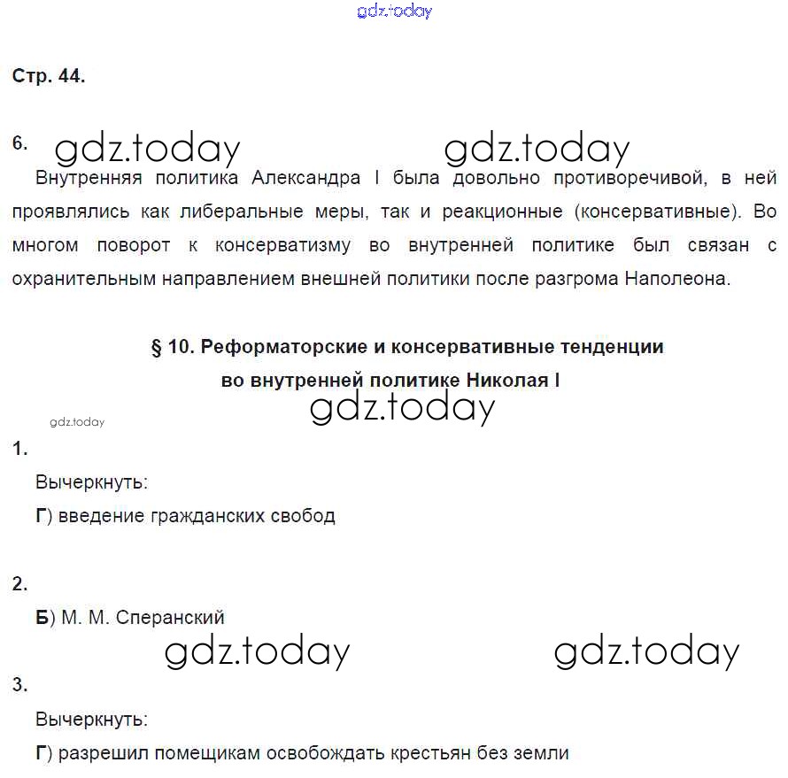 На страницах сайта gdz.today вы найдете учебный и вспомогательный материал, направленный на улучшения знаний школьной программы. ГДЗ - онлайн мир знаний Решение к части 1. Страницы 44 Рабочей тетради по Истории России для 9 класса Данилов, Косулина Просвещение УМК 2017
